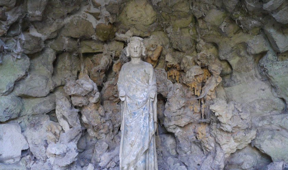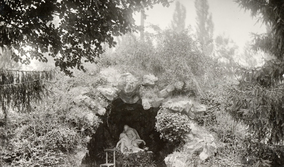Après 1869 et l’installation du noviciat des sœurs de la Sainte-Famille de Bordeaux, la clôture se referme à nouveau autour de l’abbaye et de ses jardins qui sont débarrassés de leurs installations industrielles au profit d’aménagements cultuels et symboliques. Une grotte en rocaille est édifiée, abritant une pietà ; des autels et des statues de saintes et de saints sont érigés le long d’un parcours processionnel, sillonnant le parc dont les allées sont redessinées et les canaux bordés de marronniers ; et des bosquets de pins, sapins et tilleuls sont plantés à proximité de l’ancienne église, rompant avec la géométrie des grands aplats de pelouse…