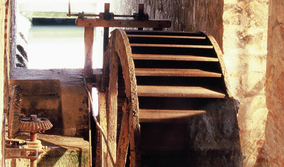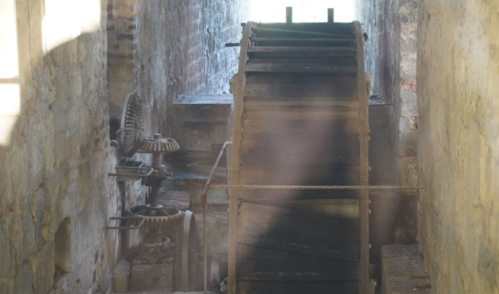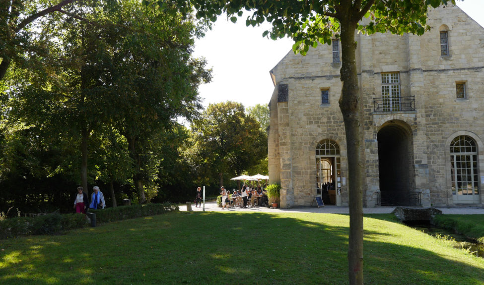 La roue encore visible au milieu du canal est une réplique de celle installée en 1876 par les sœurs de la Sainte-Famille de Bordeaux, qui pompait l’eau d’un puits voisin et la distribuait en différents points de l’abbaye.