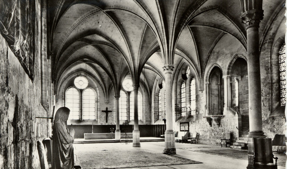Les grands vitraux géométriques et la chaire du lecteur finement sculptée datent des travaux de restauration des religieuses au XIXe siècle.