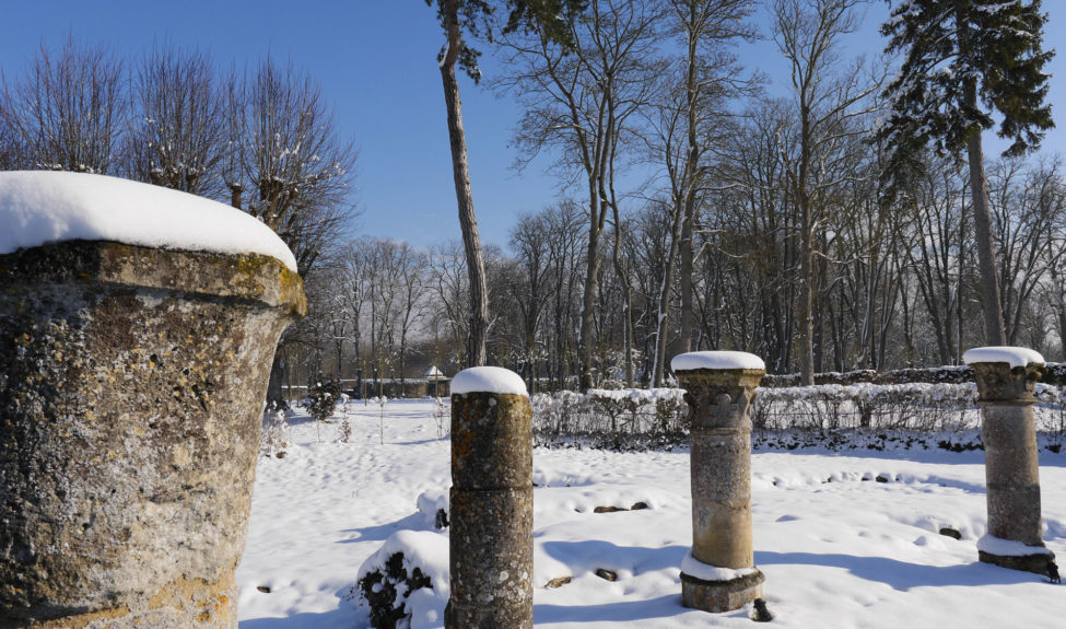 Until 1792, the monastery’s most impressive building used to stand in this now empty space. With a nave 106 meters long, the Royaumont abbey church was nearly the size of the Soissons Cathedral. Built between 1228 and 1235, it was dismantled during the French Revolution and its stone blocks repurposed. Today all that remains is a staircase turret, 36 meters high, the wall of the South aisle of the nave, and some traces of its foundations. But this has proved enough to reconstitute the original floor plan, as evidenced by the monumental stones that have been displayed in situ since 1907.