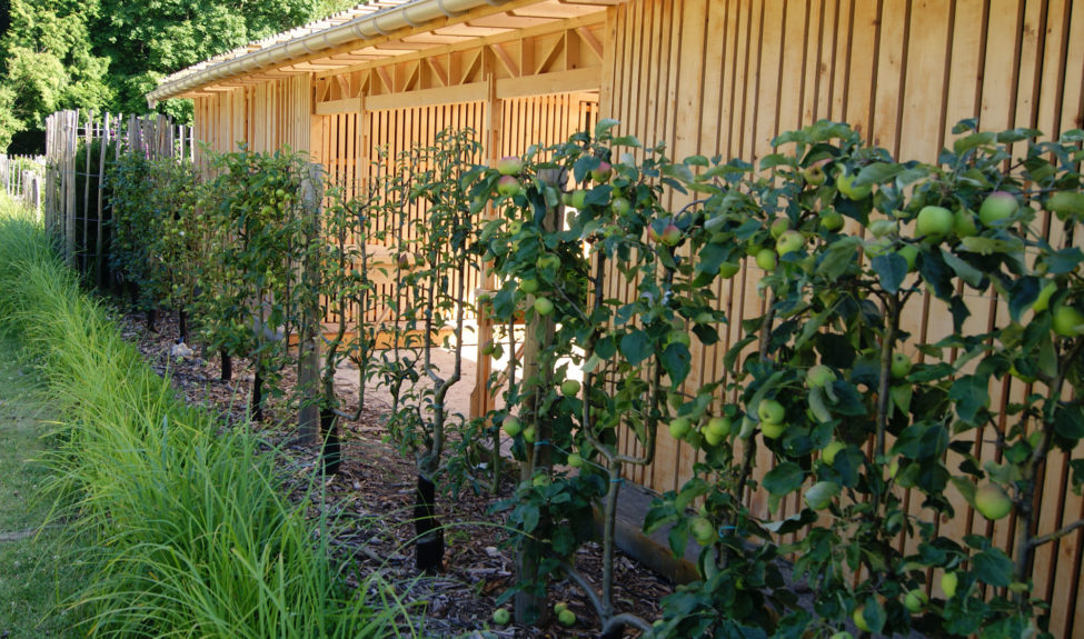 The composition operates through the contrast between hedges that structure the space and the saraband of the plants. Six squares, 18 metres on each side, a reference palette and a meadow-orchard structure the 9,000 square metre plot with its 160 vegetable varieties, 3,000 plants and 60 espalier fruit trees (apple, pear, cherry) trained in four arm, cordon or stem shapes. The garden is designed around the central square that serves as the gardener’s technical area. The other five squares offer a structural framework of evergreen yew hedges and boxwood in different heights with irregular cells of mixed borders where the edible plants are set freely. Opposite, a reference palette identifies the plants used in the garden, presenting them in rows that hark back to traditional market gardening.