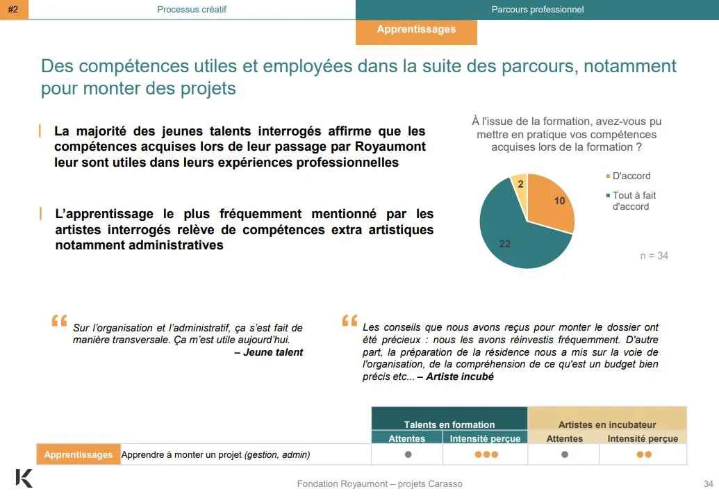 Dans ce cadre, la Fondation Daniel et Nina Carasso a incité la Fondation Royaumont à faire réaliser une évaluation externe de ses actions. Cette enquête a été confiée à un cabinet spécialisé, Kimso.