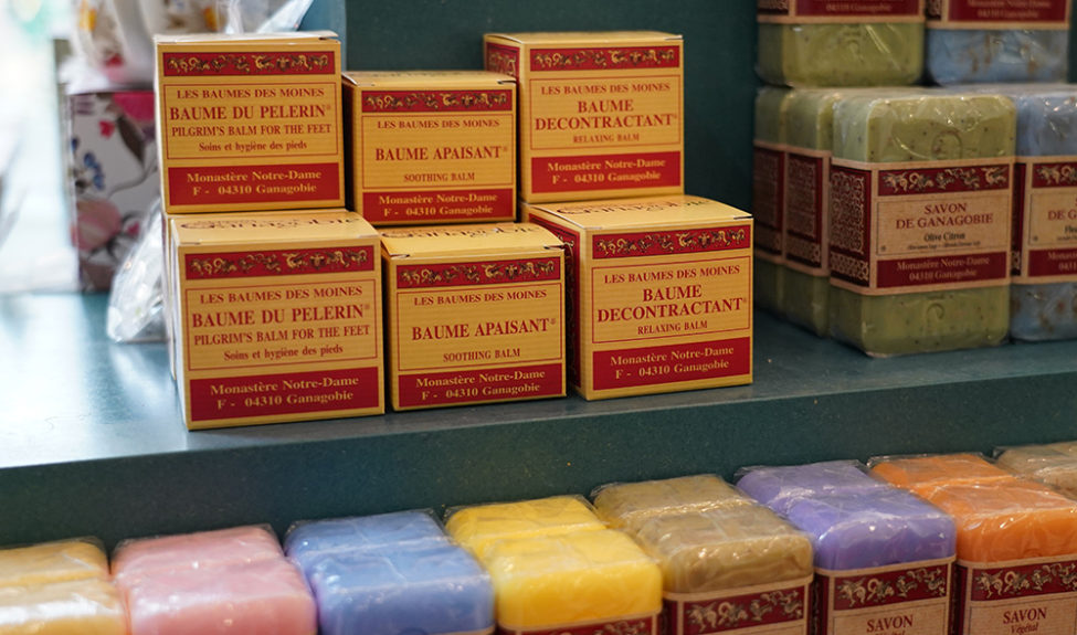 Une gamme complète de produits de beauté fabriqués par les moines bénédictins de Ganagobie : eau de toilette à la lavande ou au chèvrefeuille, baume du pèlerin, baume apaisant, baume décontractant, savon…