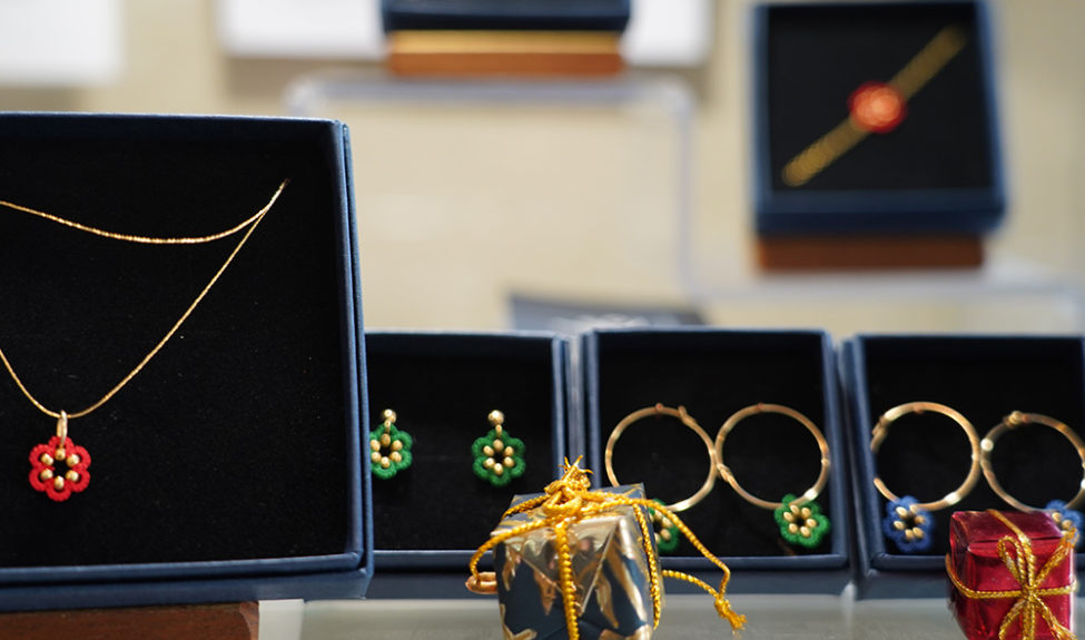 Des bijoux de la marque « Koko », réalisés en frivolité, c’est-à-dire selon une technique ancienne de dentelle…