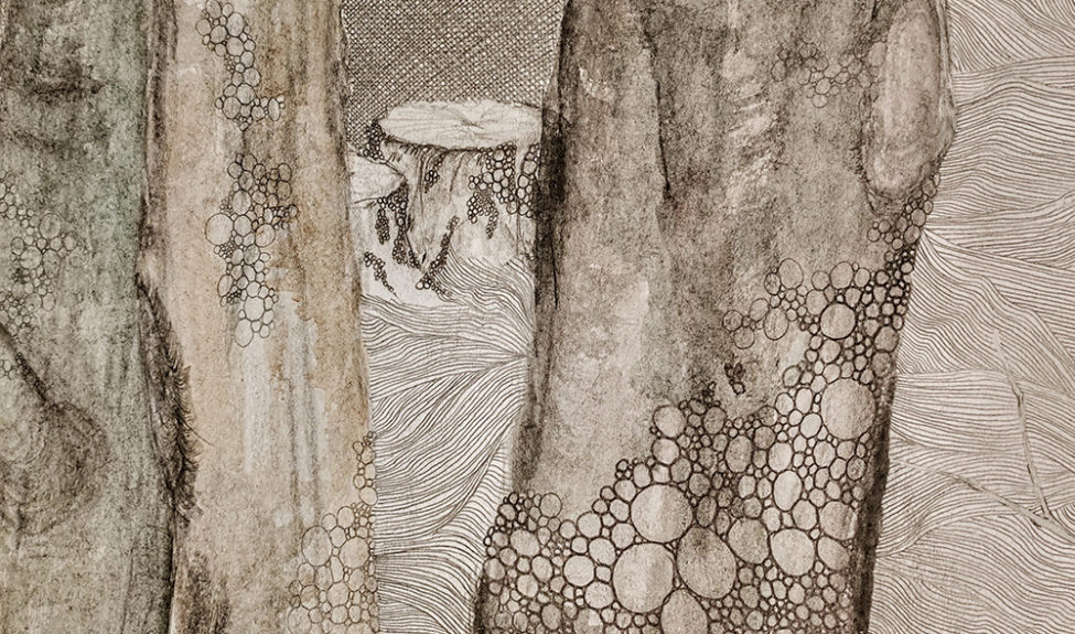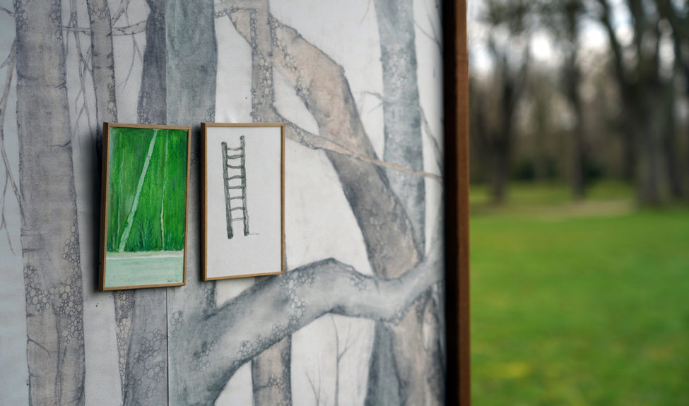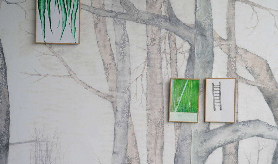 Marjorie Méa a dessiné des tilleuls sur les lés de papier qui couvrent les murs intérieurs. Son geste créateur a été minutieux, patient, avec un outil modeste, le crayon à papier, sur des encres végétales mêlées à la pluie. L’artiste aime en effet citer Gilles Clément « l’eau que tu bois a déjà été bue » ou encore le poète Guillevic « l’eau que tu bois a connu la mer ». L’idée d’une mémoire de l’eau participe à la dimension onirique de son travail. « Par le dessin, j’ai souhaité me rapprocher du temps de la nature : quand l’arbre pousse, son temps n’a rien à voir avec le nôtre. Tenter avec un geste modeste et répété de traduire ce temps, de réveiller en moi une mémoire du paysage et la partager avec le regardeur pour se « tapisser » de forêt » explique-t-elle. Des œuvres de plus petite taille, mouvement plus libre d’eau et d’encres viennent ponctuer le propos.
