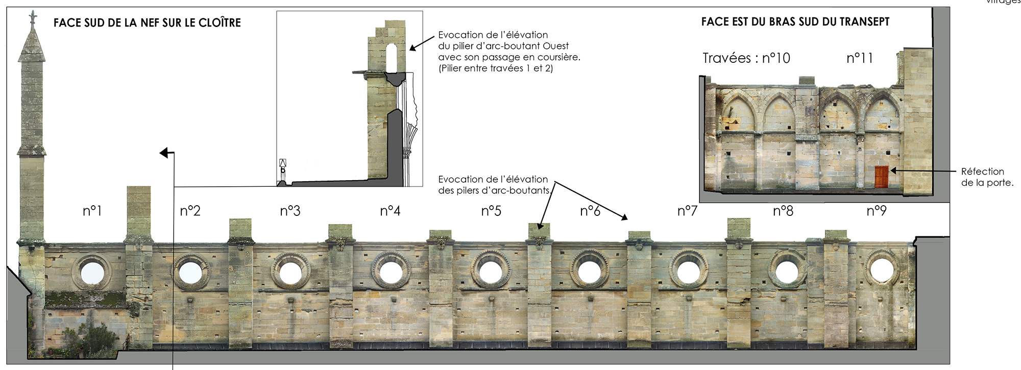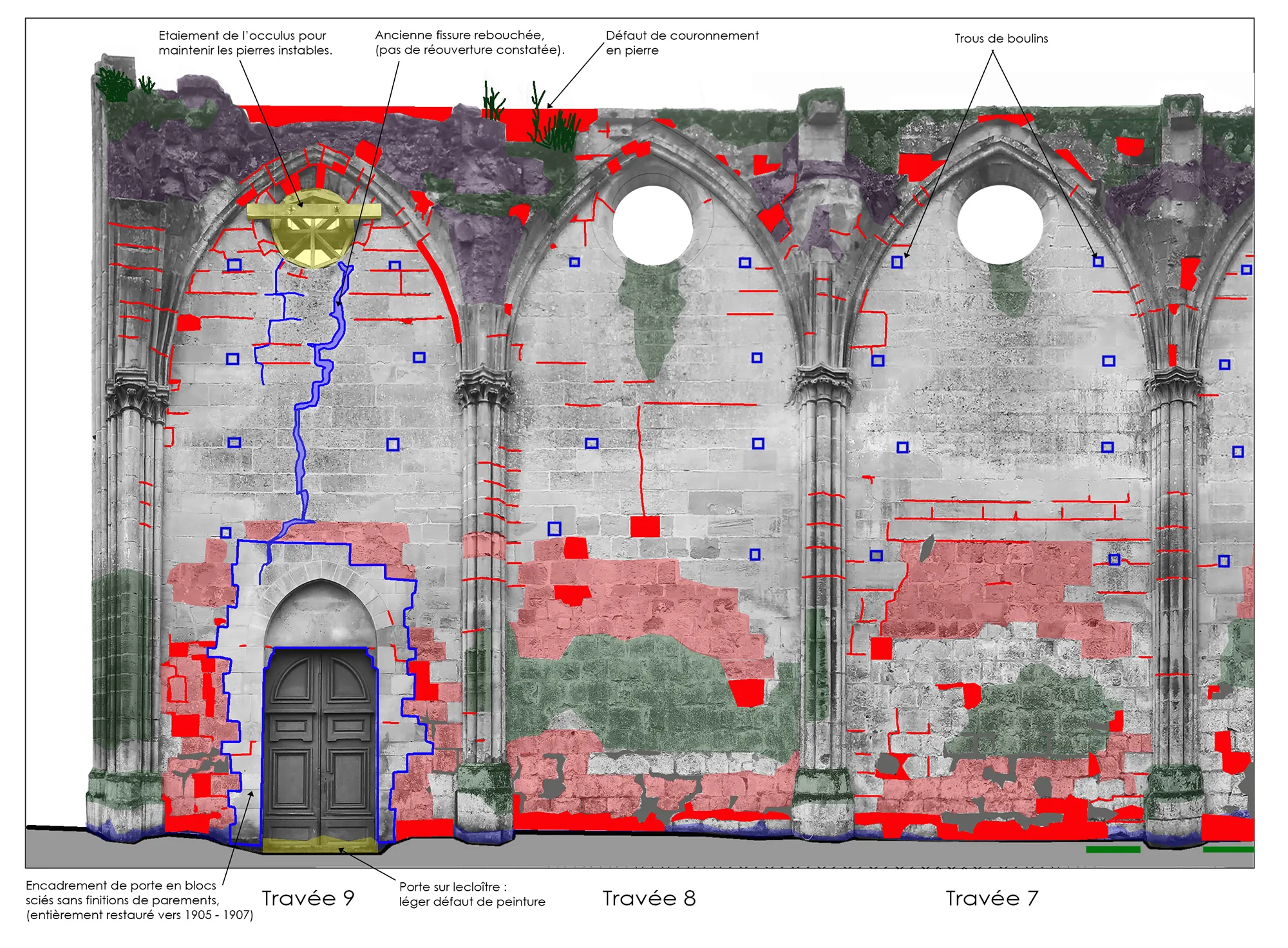 Jusqu’au printemps, ils restaureront, consolideront et traiteront ce mur. Une mise en valeur des anciennes traces d’adossement du porche et un remplacement des menuiseries de la façade sont également prévus. Le relevé ci-dessous montre en rose, les pierres de taille dont le parement est altéré ; en violet : les maçonneries instables ; en jaune : les menuiseries ou ferronneries défectueuses ; en vert : les parties gagnées par la végétation…