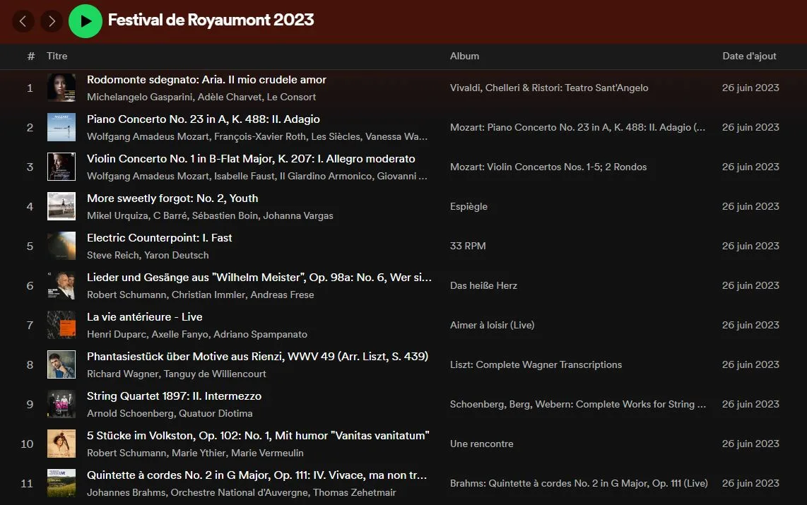 Cherchant sans cesse de nouvelles façons de se rapprocher de son public, la Fondation Royaumont a créé une playlist sur Spotify, la première plateforme mondiale de streaming musical avec plus de 350 millions d’utilisateurs réguliers et un rythme de croissance à 2 chiffres.